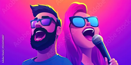 couple singing karaoke duet song into microphone on stage at karaoke club