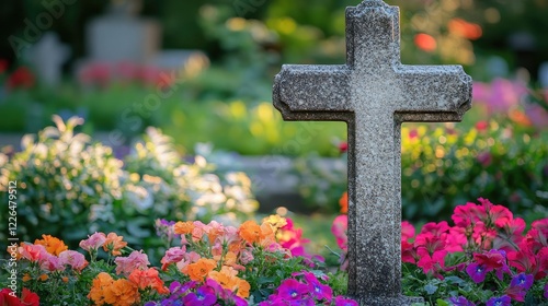 A stone cross surrounded by vibrant flowers in a serene cemetery, evoking a sense of peace and remembrance.