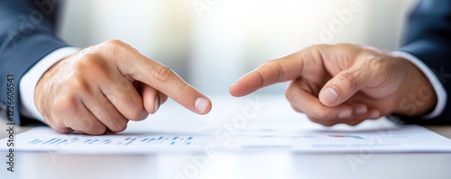 discussion agreement negotiation business compromise concept. Business professionals discussing documents with hands pointing at the papers.