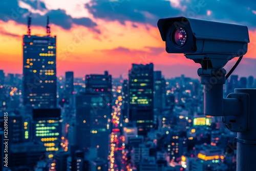 Surveillance camera overlooking a vibrant city skyline at sunset