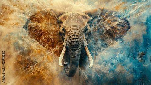Majestic elephant emerges from colorful dust cloud, African savanna, powerful nature image