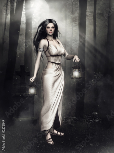 Duch młodej kobiety z lampionami w ciemnym lesie