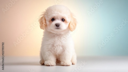 Adorable Fluffy Maltese Puppy Sitting Against Pastel Background. Generative AI