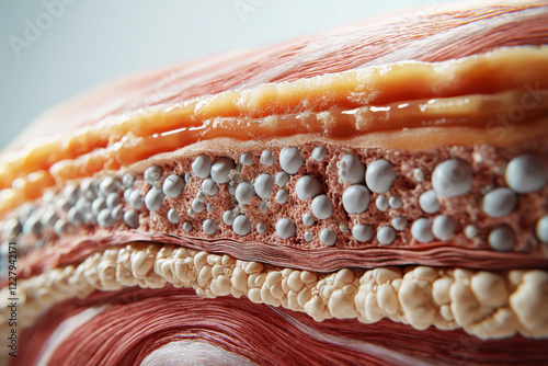 High-resolution cross-section revealing human thigh muscle layers, tendons, and fat cells in photorealistic detail