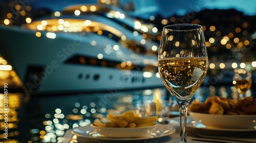 Luxurious Evening on a Yacht: Wine Glass and Warm Glow of Bokeh Lights Reflecting on Water