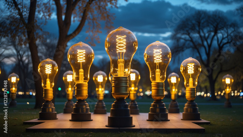 Golden Edison Bulb Sculptures Glowing Under Twilight Sky in a Serene Park Setting