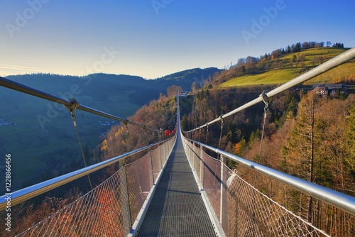 A suspension bridge leads over autumnal landscapes with hills in the background, Black Forest Line, suspension bridge, Todtnau, Baden- Württemberg, Germany, Europe