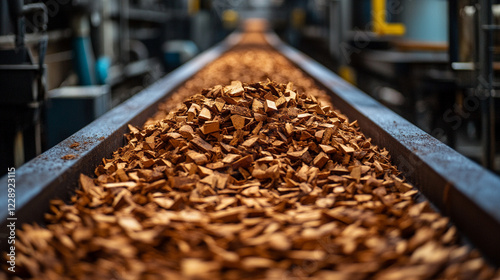 Wood chips moving on a conveyor belt in a factory symbolizing sustainable heating materials with a modern, minimalistic aesthetic and bright tone, blurred background and empty caption space