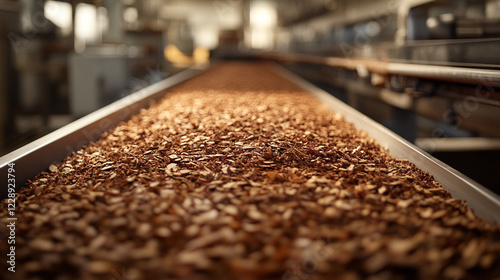 Wood chips moving on a conveyor belt in a factory symbolizing sustainable heating materials with a modern, minimalistic aesthetic and bright tone, blurred background and empty caption space