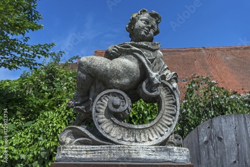 Baroque putto figure on a pedestal, Nördlingen, Bavaria, Germany, Europe