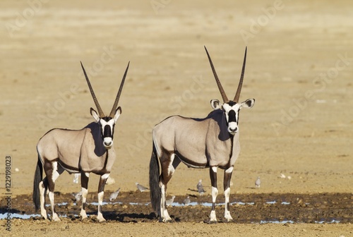 Gemsboks (Oryx gazella), two males at a waterhole, Kalahari Desert, Kgalagadi Transfrontier Park, South Africa, Africa
