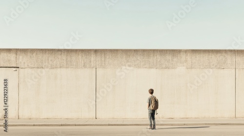 A solitary figure stands before a vast concrete wall under a clear sky, contemplating possibilities