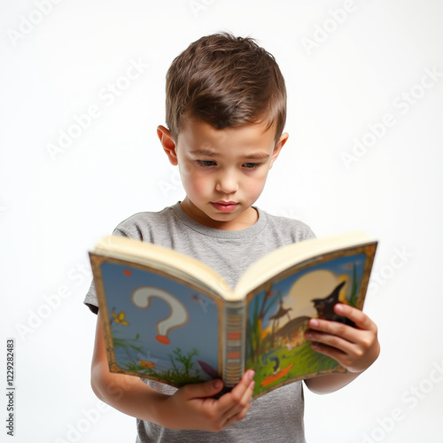 Un niño lindo de 6 años está leyendo un libro. Un niño que se centra en el libro. Estudiantes inteligentes de primaria.