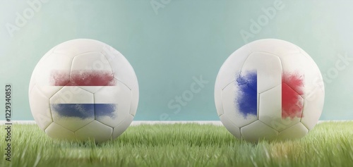 Netherlands vs France football match infographic template for Euro 2024 matchday scoreline announcement. Two soccer balls with country flags placed against each other on the green grass with copy space. AI generated art