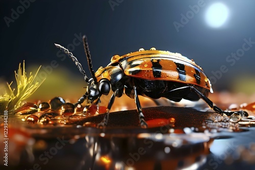 Namib desert beetle in morning fog water droplets on back survival adaptations, AI generated