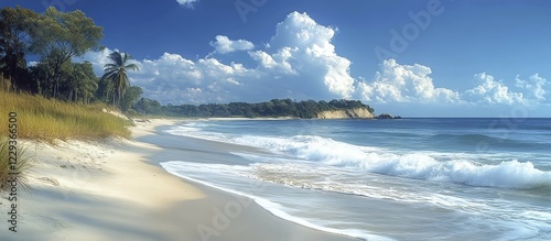 Tranquil beach with waves lapping on the shore, white sand, and lush greenery, AI generated