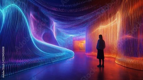 Immersive Digital Art Installation: A Woman Exploring a Vibrant, Luminous Light Sculpture Exhibit