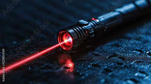 Red laser pointer on dark surface. Suitable for presentation tools, technology equipment, and optical devices.