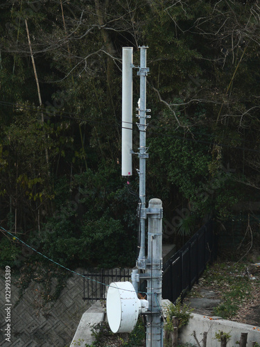 遠方通信基地局と交信するためのパラボラと棒アンテナ