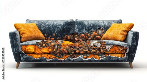 A dynamic cutaway view of a sofa, exposing bed bugs thriving beneath the surface, contrasting with the pristine and stylish appearance above