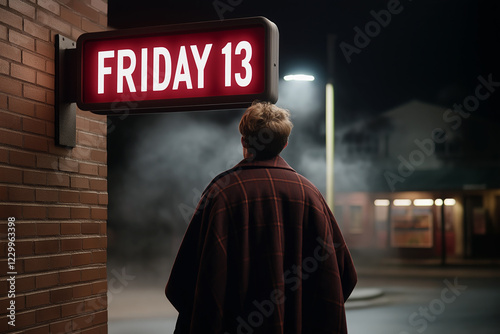 Man figure in long cloak standing near signboard with Friday 13 inscription, night, fog, street lamp