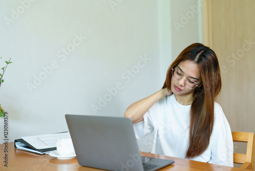 Beautiful Asian woman working from home. Holding neck with tired expression while using laptop wooden desk. Wearing glasses and white shirt. Work-related stress and discomfort from prolonged sitting