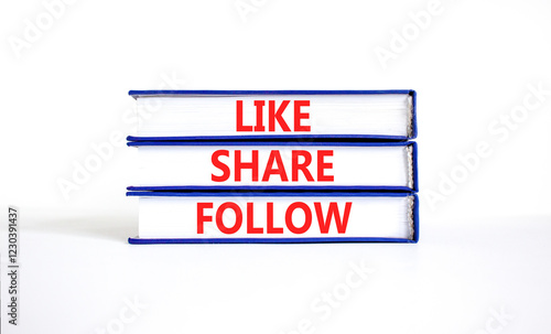 Like share follow symbol. Concept words Like Share Follow on beautiful blue white books. Beautiful white background. Business like share follow concept. Copy space.