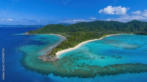 Aerial View of Tropical Island Beach and Lush Green Mountains