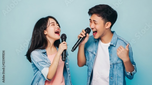 Young couple singing with wireless microphones on blue background