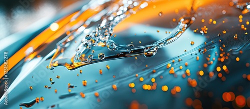 Hydrophobic nano technology illustrated on a modern car windshield with vibrant orange and blue tones, depicting water droplets and dynamic splashes.