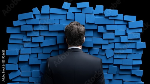 Facing the Wall: A solitary figure confronts an imposing wall of vibrant blue, symbolizing challenges, barriers, and introspective moments.