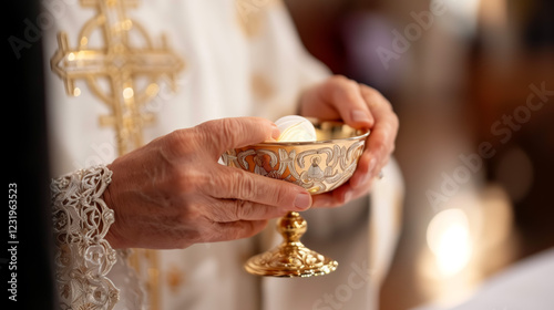 Dłonie księdza trzymające ozdobny złoty kielich podczas ceremonii religijnej - Komunia