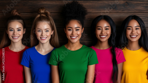 Pięć uśmiechniętych kobiet w kolorowych koszulkach