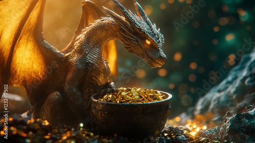 Golden treasure guarded by a majestic dragon amidst a mystical green setting, evoking the spirit of St. Patrick's Day