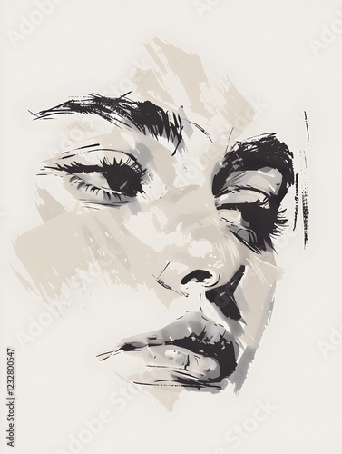Illustration féminine poétique, croquis d'un visage avec un gros plan sur l'œil et le nez, image artistique, noir et beige