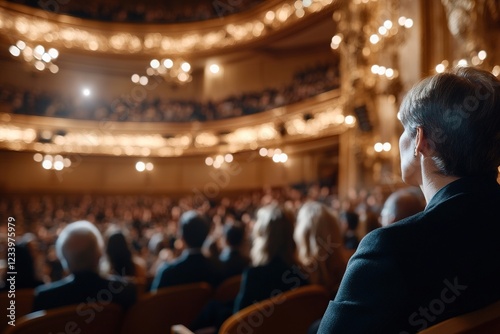 Attendees are seated in an elegantly designed concert hall, enjoying a captivating performance beneath softly glowing chandeliers