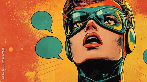 This vibrant comic-style image showcases a heroic figure ready for action, with colorful effects and speech bubbles for dialogue.