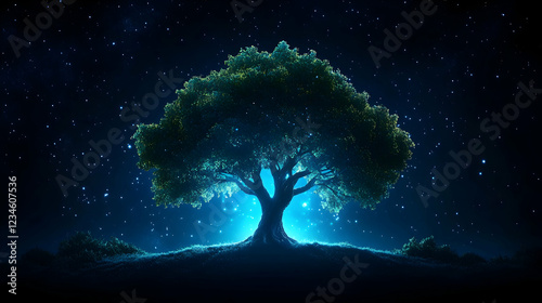 Glowing tree at night, starlit sky, peaceful nature scene, fantasy illustration, website background