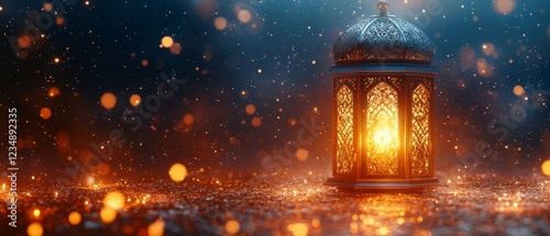 A Glowing Lantern Sits On A Sparkly Surface, Surrounded By Warm, Magical Light. Perfect For Ramadan Or Any Festive Occasion.