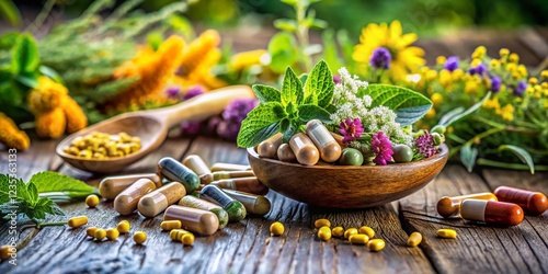 Vibrant Herbal Remedies & Colorful Capsules: Natural Health Long Exposure Wooden Display