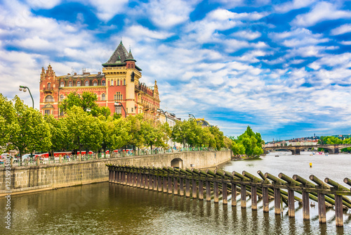 A picturesque view of Prague along the Vltava River, showcasing elegant traditional buildings lining the streets, bathed in warm, idyllic colors and set against a brilliant blue sky with soft clouds.