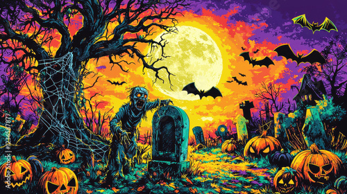 vibrant illustration of haunted graveyard with pumpkins, bats, and full moon. eerie atmosphere captures Halloween spirit