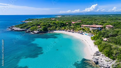 Tropical beach resort aerial view; turquoise water, white sand, lush vegetation; ideal for travel brochures