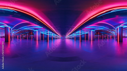 360 degree full panorama environment map of dark empty big hall with neon lights 3d render illustration hdri hdr vr virtual reality. 3D Illustration