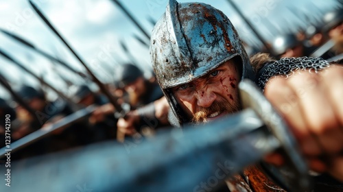 In a dramatic battle scene, a fierce warrior charges with his sword drawn, embodying power and intensity among a throng of armored soldiers ready for combat.