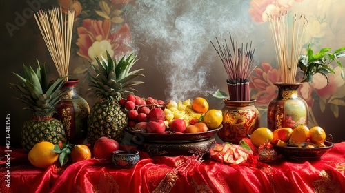 memorial display with incense, fruit, and red fabric to honor ancestors during Chinese New Year.