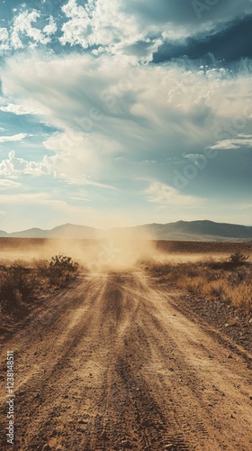 Dusty Dirt Road Through Open Landscape Under Blue Sky and Clouds