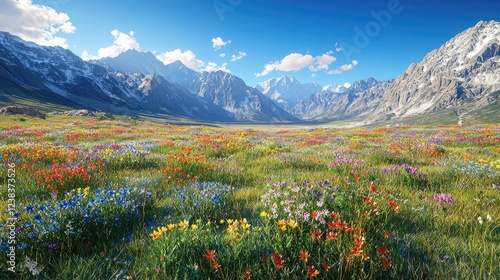 National parks nature concept. Vibrant wildflower meadow with mountains and blue sky under sunny conditions.
