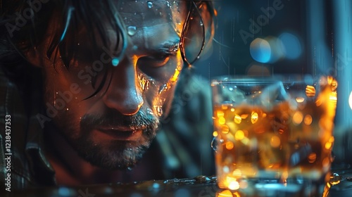 A somber depiction of alcohol addiction, showcasing a person struggling with alcoholic tendencies, symbolizing the distressing issue of drinking problems in society.