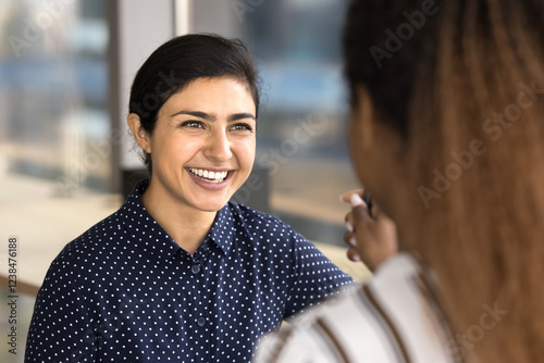 Close up cropped view attractive Indian woman employee enjoy pleasant friendly conversation with African female teammate indoors, listening ideas, creative solutions, working together on joint task